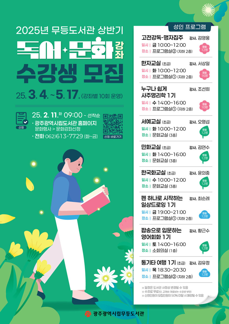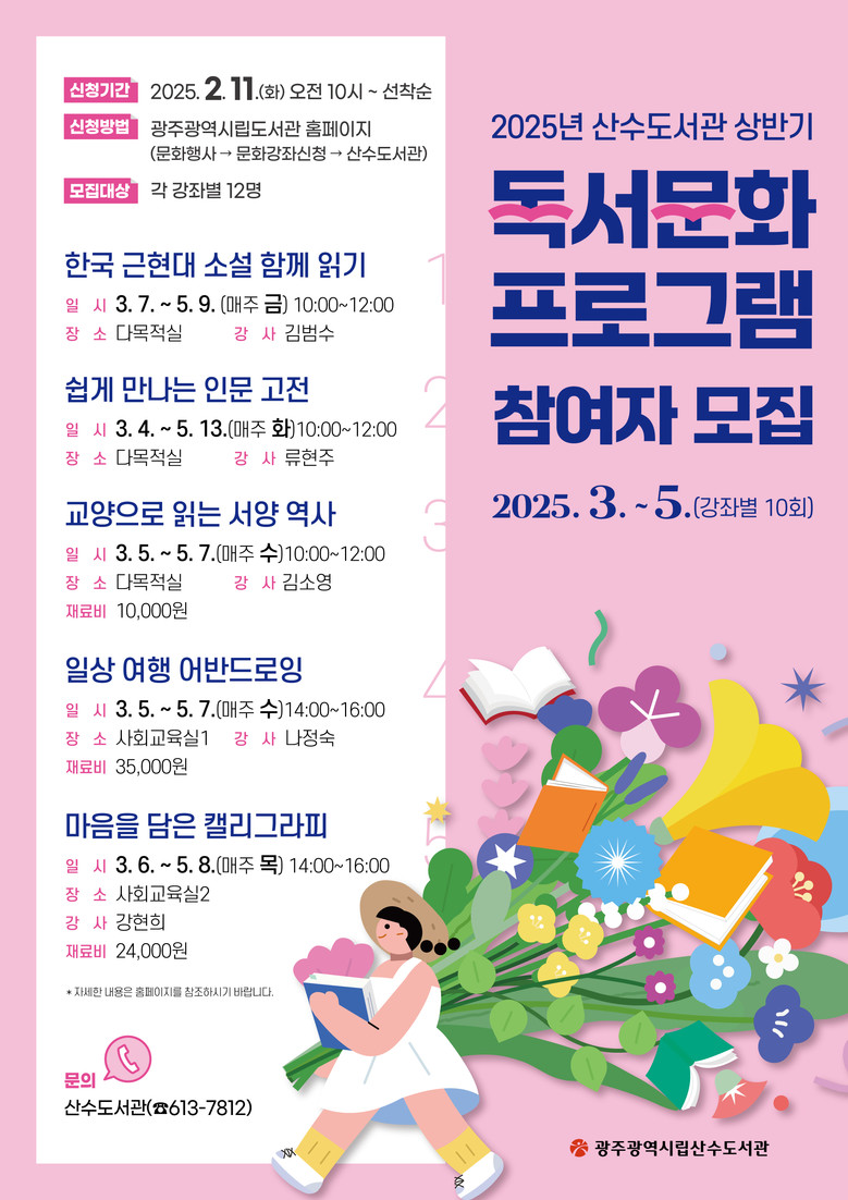 상반기 독서문화 강좌의 수강료는 무료이지만 재료비와 교재비는 수강생이 부담한다. 강좌 수강을 희망하는 시민은 11일부터 광주광역시립도서관 누리집(홈페이지)의 ‘문화강좌신청’란을 통해 접수할 수 있다.