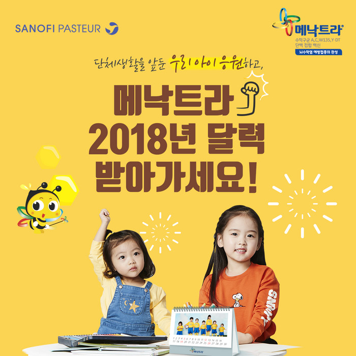 2018년 브랜드 달력은 ‘2017 제2회 메낙트라® 우리 아이 모델 선발대회’에서 선정된 모델 6명과 함께 ‘우리 아이들의 사계절 건강한 단체생활을 응원한다’는 주제로 봄, 여름, 겨울, 가을 별 콘셉트에 맞춰 촬영한 사진이 담겼다. 내년을 의미하는 숫자인 ‘2,018’명에게 선착순으로 배부되며, 메낙트라® 공식 홈페이지에서 11월 6일부터 누구나 신청이 가능하고 12월 중 우편으로 배부될 예정이다. 메낙트라® 모델들의 깜찍하고 귀여운 모습이 담긴 사진과 함께 계절별로 주의해야 할 수막구균성 질환 정보가 담겨 빠른 시일 내에 달력 신청이 마감될 것으로 예상된다.