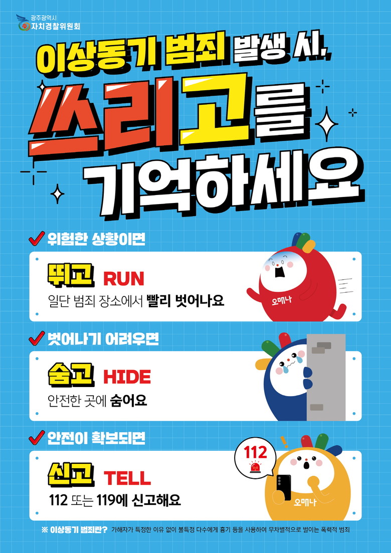 ‘시민 행동요령 쓰리고’는 ‘뛰고→숨고→ 신고해요’ 등 3단계로 구성돼 있다. 광주시민에게 친숙한 관광캐릭터인 ‘오매나’를 활용해 이해하기 쉽고 즉각 대응이 가능하도록 제작됐다.