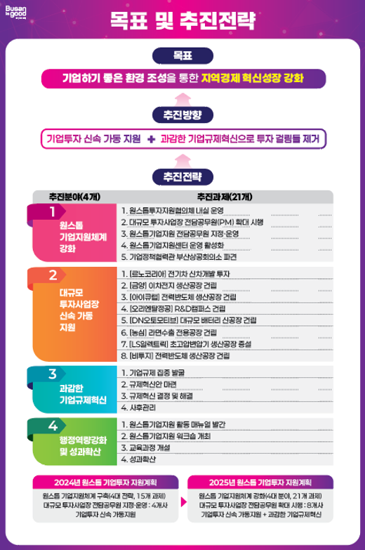 [원스톱 기업지원체계 강화] '원스톱투자지원협의체 내실 운영', '대규모 투자사업장 전담공무원(PM) 확대 시행', '원스톱기업지원 전담공무원 지정·운영', '원스톱기업지원센터 운영 활성화', '기업정책협력관 부산상의 파견'을 통해 부산형 원스톱 기업지원체계를 강화해 기업하기 좋은 환경을 만들어 나간다.