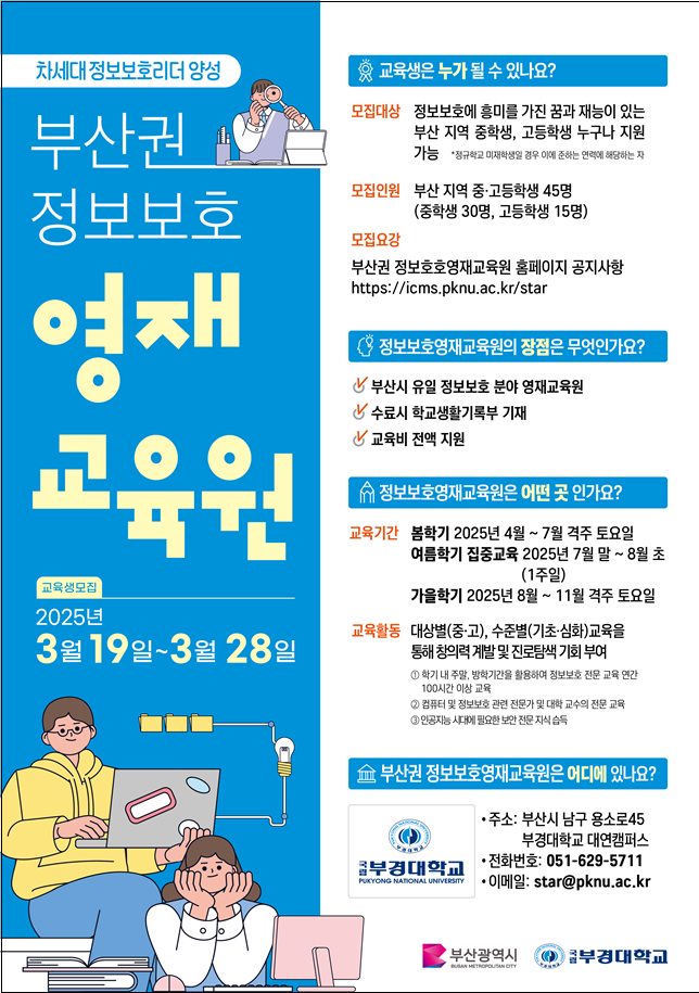 ◈ 3.19.~3.28. 원서 접수, 최종 합격자는 4월부터 11월까지 부경대학교 등에서 교육… 정보보호경진대회 참가 및 연구 성과 발표, 기업 탐방 등 다양한 프로그램 진행돼 [부산 세계타임즈=이용우 기자] 부산시(시장 박형준)는 부산지역 중·고등학생을 대상으로 차세대 정보보호리더 양성을 위한 '2025년도 부산권 정보보호영재교육원'의 신입생을 오는 3월 19일부터 3월 28일까지 모집한다고 밝혔다.