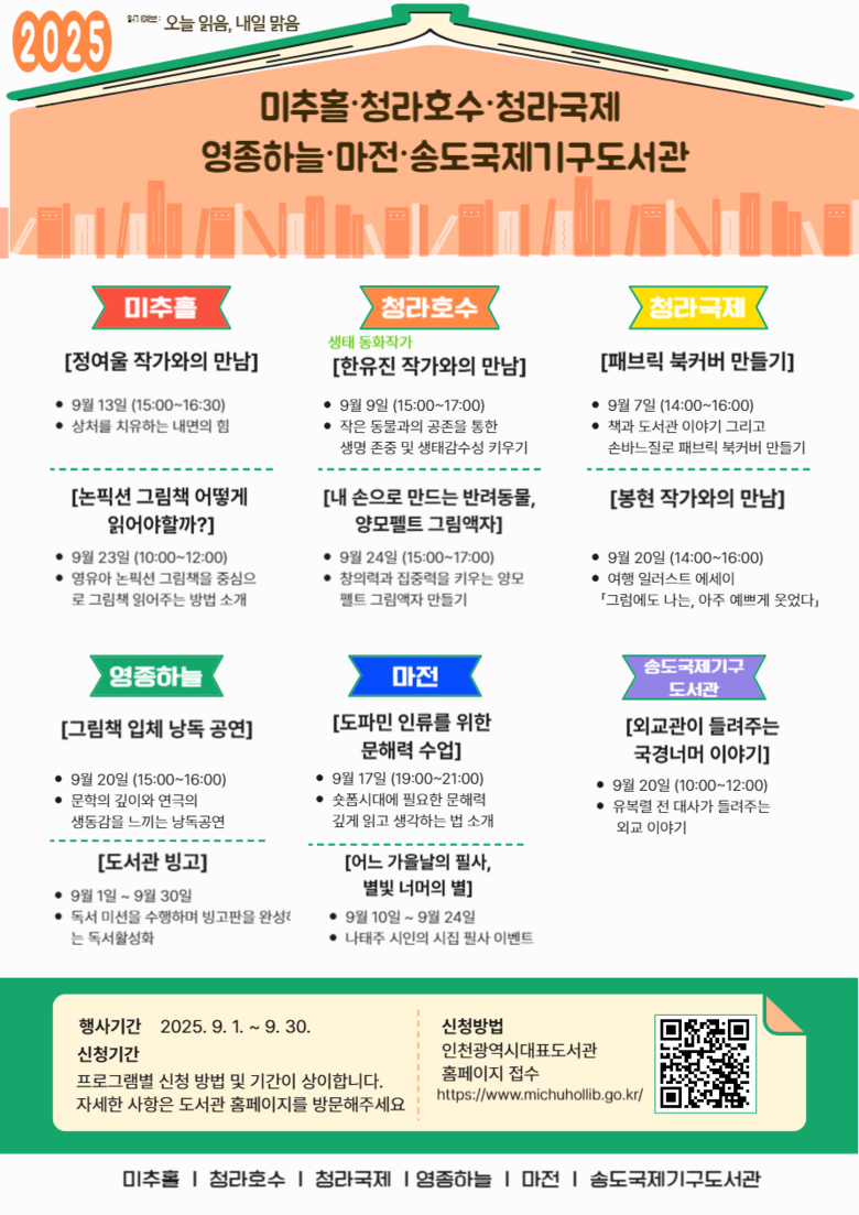 미추홀도서관에서는 9월 13일 ‘정여울 작가와의 만남’을 개최해 독서와 삶에 대한 이야기를 나눈다. 청라호수도서관에서는 9월 9일 생태 동화 작가 한유진과 함께 자연의 가치를 되새기는 시간을 마련한다.