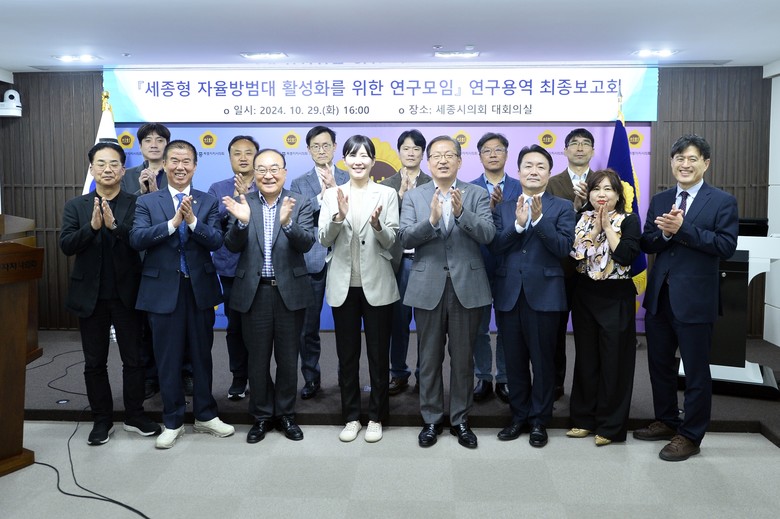 연구결과 세종시 치안환경 현황은 자율방범대와 경찰과의 협력이 미흡하고, 경찰관보다 자율방범대원의 체감 안전도가 낮은 것으로 나타났다. 연구모임 회원들은 자율방범대 활성화 방안으로 ▲주민치안 참여방안 마련 및 확대 ▲지역치안 수요를 반영한 자율방범대 운영 ▲자율방범대 체감 안전도 제고를 위한 조례 정비 ▲세종형 마을치안 공동체 구축 방안 등을 제시하였다.