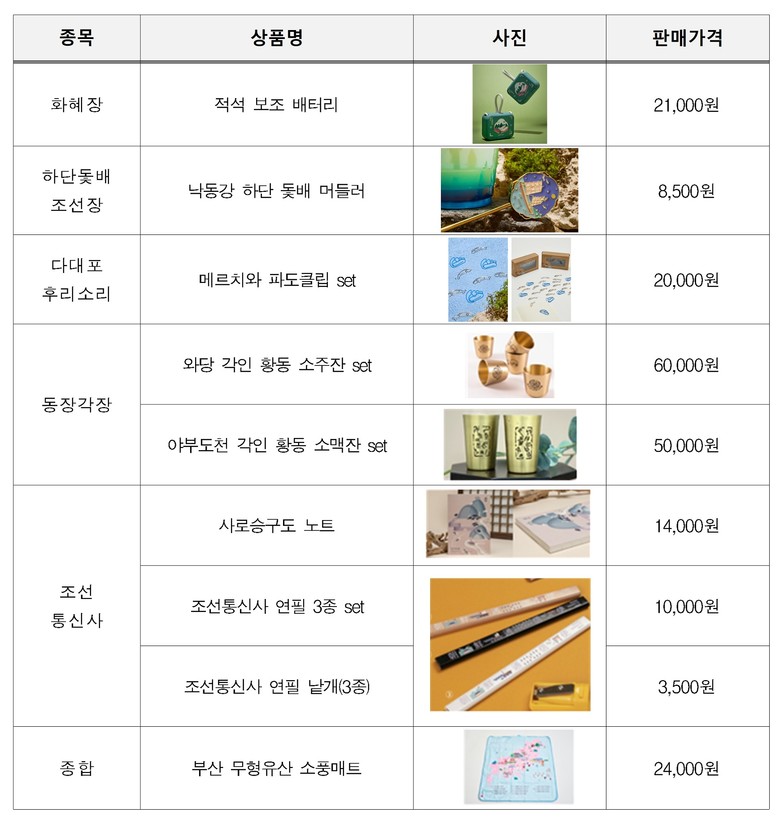 연도별 개발 품목*은 ▲2021년 7개 상품(무드등, 부채, 에어팟케이스, 티셔츠, 텀블러, 유리컵, 머그컵) ▲2022년 11개 상품(책갈피, 에코백 2종, 컵받침(티코스터), 손수건 2분야, 무드등 2분야, 양장 노트, 북보틀, 소주잔 세트) ▲2023년 10개 상품(방향제 2분야, 소스볼, 스카프, 컵받침(티코스터), 골프공 마크 세트, 황동 소맥 잔, 황동 접시, 고블렛잔, 하이볼잔) ▲2024년 7개 상품(방향제(디퓨저), 항아리 주병, 보조배터리, 하단돛대 머들러, 자수 수건, 소풍 매트, 메르치와 파도 클립)을 개발했다. ▲올해(2025년)는 오르골, 금속 뱃지(4종), 마스킹테이프, 손수건, 열쇠고리, 플라스틱 트레이 등 6개 품목을 개발할 예정이다.