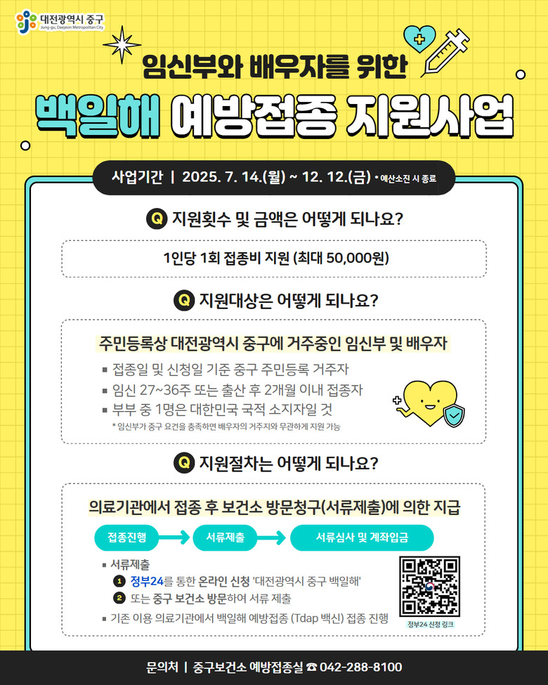 이 사업은 임신 27주부터 출산 후 2개월까지 백일해 예방접종을 완료한 임신부와 배우자에게 접종 비용을 지원하는 것으로, 지난 7월부터 시행된 이후 현재까지 70명의 임신부와 배우자가 혜택을 받는 등 큰 호응을 얻고 있다.