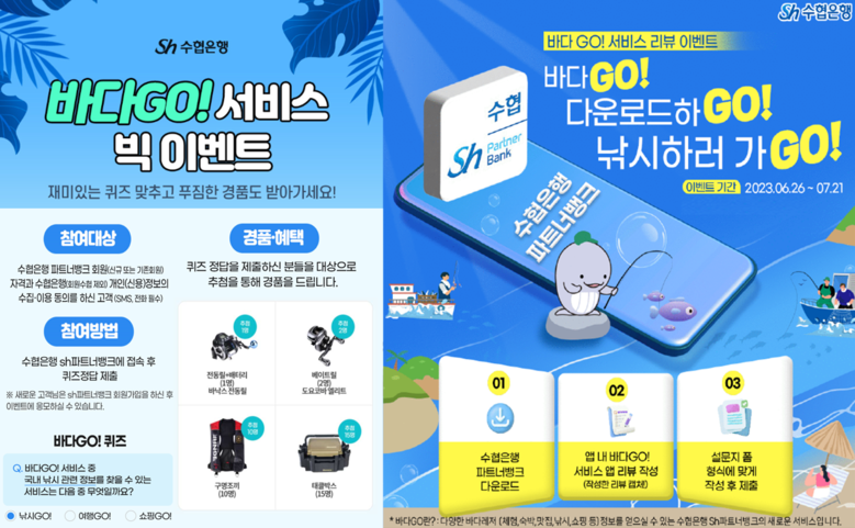 수협은행은 바다GO! 서비스 런칭을 기념해 바다GO!가 탑재된 수협은행 모바일뱅킹앱 파트너뱅크 ‘낚시 퀴즈’ 이벤트를 오는 7월 31일까지 진행한다.
