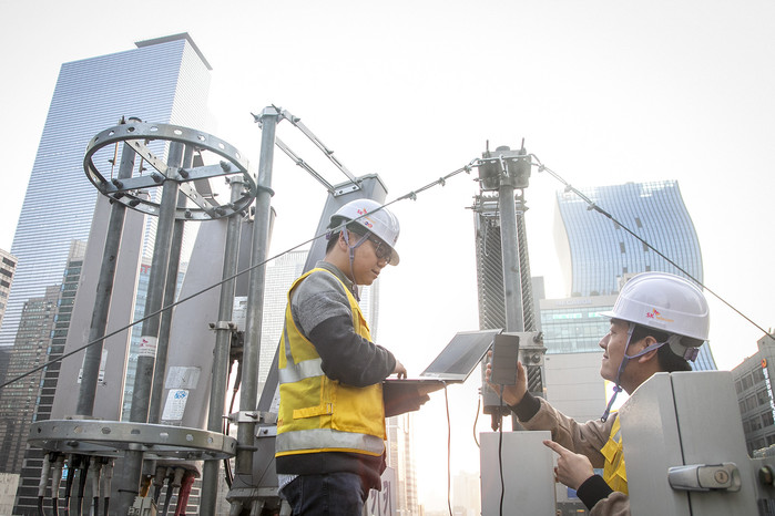 사진설명: SK텔레콤이 갤럭시S10 출시와 함께 국내 유일 최고 속도 1.2Gbps 급 LTE 서비스를 제공한다고 5일 밝혔다. SK텔레콤 직원들이 강남역 사거리 인근에서 기지국 점검을 하고 있는 모습.