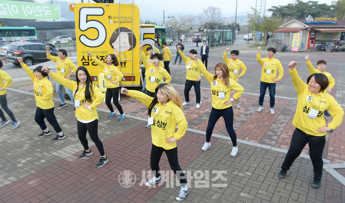 18일 오전 인천 계양역 앞에서 심상정 정의당 대선후보 선거운동원들이 율동을 하며 출근길 유권자들에게 지지를 호소하고 있다. 2017.04.18.