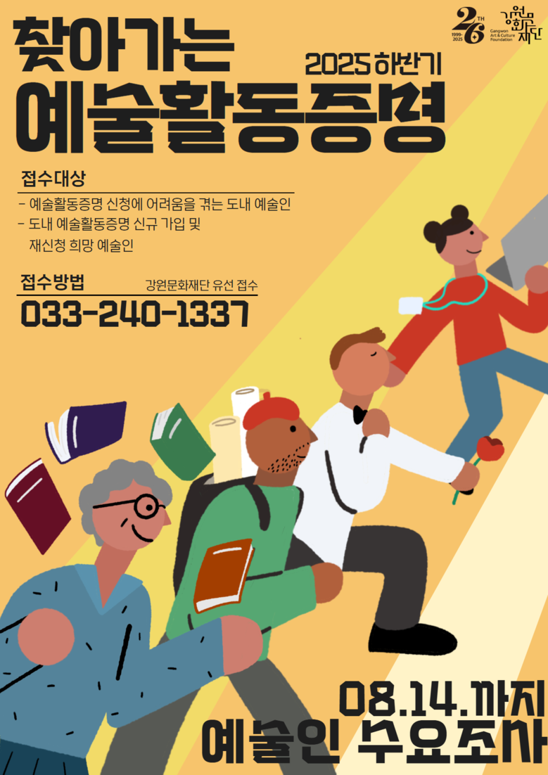 신청은 강원예술인복지지원센터(☎033-240-1337) 전화로 받으며, 9월부터는 본격적인 찾아가는 서비스를 시작한다.