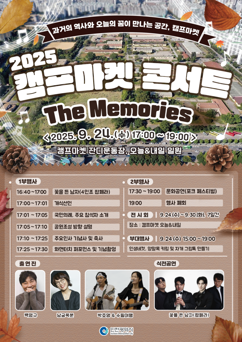 – 음악과 전시, 참여형 프로그램으로 시민과 함께하는 문화공연 – [인천 세계타임즈=심하린 기자] 인천광역시(시장 유정복)는 오는 9월 24일 오후 5시, 부평 캠프마켓 개방공간인 잔디운동장에서 ‘2025 캠프마켓 콘서트 The Memories’를 개최한다고 밝혔다.