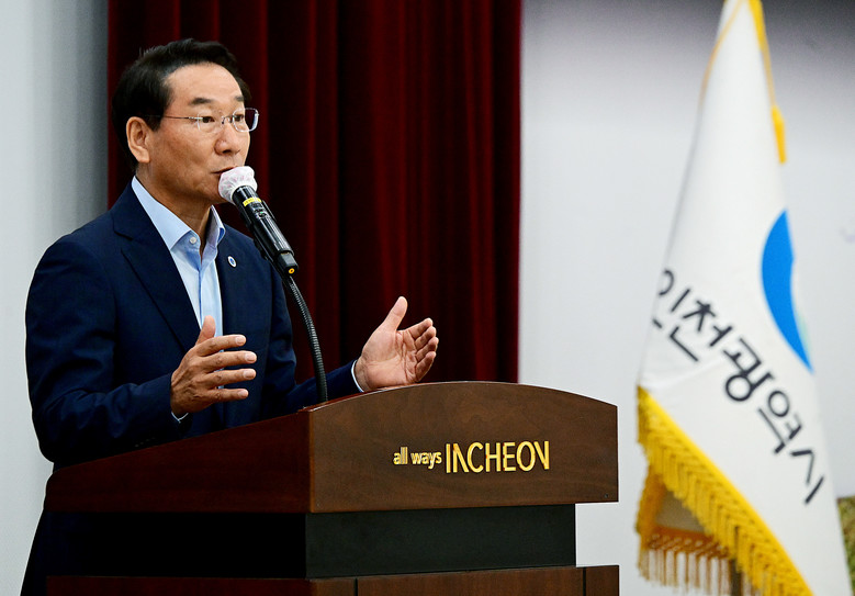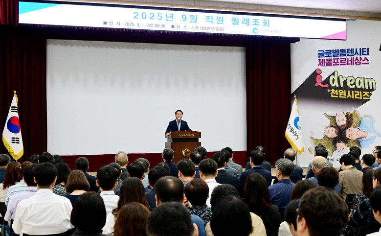 [인천 세계타임즈=심하린 기자] 인천시(시장 유정복)는 1일, 시청 대회의실에서 전 직원이 참석한 가운데 9월 월례조회를 개최했다. 이번 조회는‘변화를 이끄는 힘, 우수제안’을 주제로 소통과 공감을 나누며 창의적 정책 아이디어를 공유하는 자리로 마련됐다.