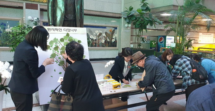 병원 로비에는 환자안전 인식을 고취 시키기 위해 각종 게시물을 설치했다. 정확한 환자확인에 적극적으로 참여하겠다는 의지를 표하는 ‘환자안전나무 만들기’ 이벤트를 진행해 환자 및 보호자가 진료과정에 참여하는 것이 중요하다는 것을 강조했다.