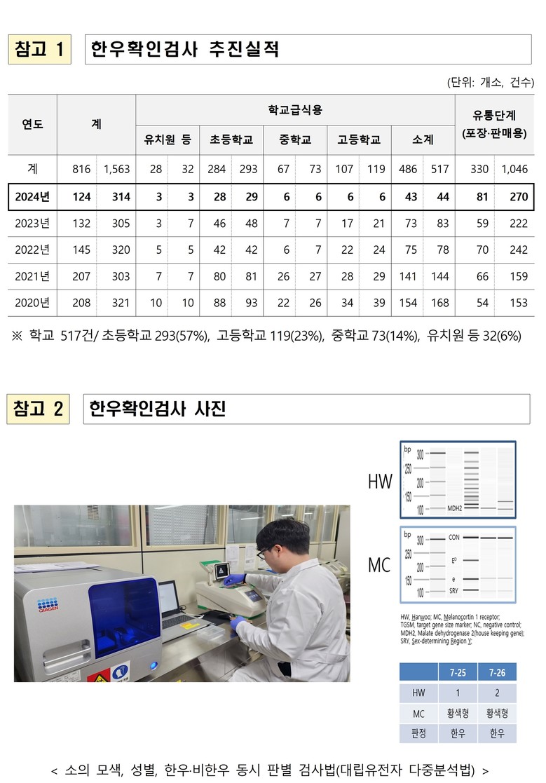 ➋ 검사기간 및 방법: 2025년4~12월/한우 확인검사(유전자검사법) [강원도 세계타임즈=김민석 기자] 강원특별자치도 동물위생시험소(소장 정행준, 이하 ‘동물위생시험소’)는 4월부터 12월까지 도내 학교 급식에 납품되는 한우고기와 식육 판매장에서 한우로 판매되는 소고기를 대상으로 ‘한우 확인검사’를 실시한다고 밝혔다.