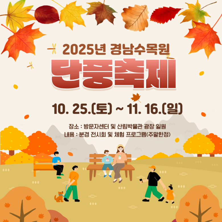 한편, 경상남도수목원은 다양한 수종과 계절별 꽃이 조화를 이루는 산림복합문화공간으로 가을철이면 수려하게 물든 단풍 풍경으로 도민들에게 사랑받는 명소로 자리매김하고 있다.