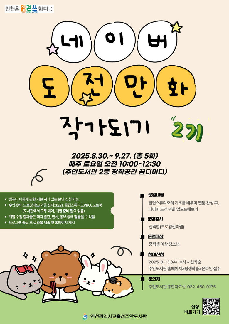 참여 신청은 8월 13일 오전 10시부터 주안도서관 누리집(https://lib.ice.go.kr/juan)에서 가능하며, 자세한 사항은 종합자료실(☎032-450-9135)로 문의하면 된다.