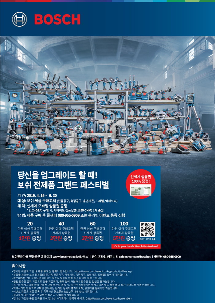 전동공구 분야의 글로벌 리더 보쉬 전동공구(사업부문장 박진홍)가 전동공구 수요가증가하는 본격적인 건설 및 인테리어 시즌을 맞아 제품 구매 고객에게 상품권을 100% 증정하는 ‘보쉬 전제품 그랜드 페스티벌’을 실시한다고 밝혔다.