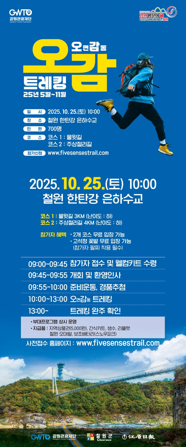 최성현 강원관광재단 대표이사는 “이번 ‘오감트레킹’은 철원의 가을을 오감을 통해 생생하게 느낄 수 있도록 기획된 행사”라며, “소중한 사람들과 함께 자연을 온몸으로 체험하고, 강원의 매력을 깊이 느끼는 소중한 기회가 되기를 바란다”라고 전했다.