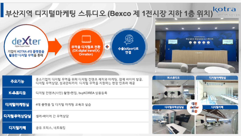‘부산 덱스터’는 벡스코 제1전시관 지하 1층에 위치해 있으며, 기업과 구매자(바이어)가 비즈니스를 하는 현장 기반 시설(인프라)로서 촬영 스튜디오, 디지털 무역상담실, 디지털 마케팅실 등의 공간으로 구성돼있다.