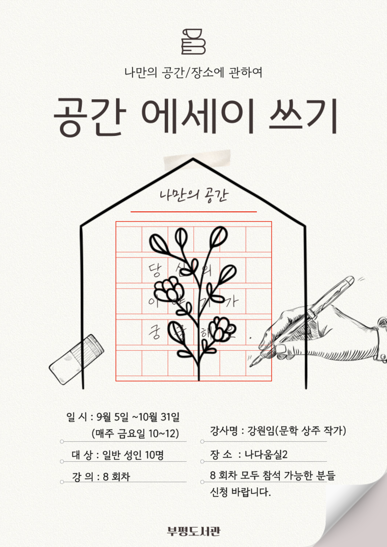 강의는 9월 5일부터 매주 금요일 오전 10시 8회에 거쳐 진행하며, 신청은 8월 21일 오전 10시부터 부평도서관 누리집에서 선착순으로 가능하다.