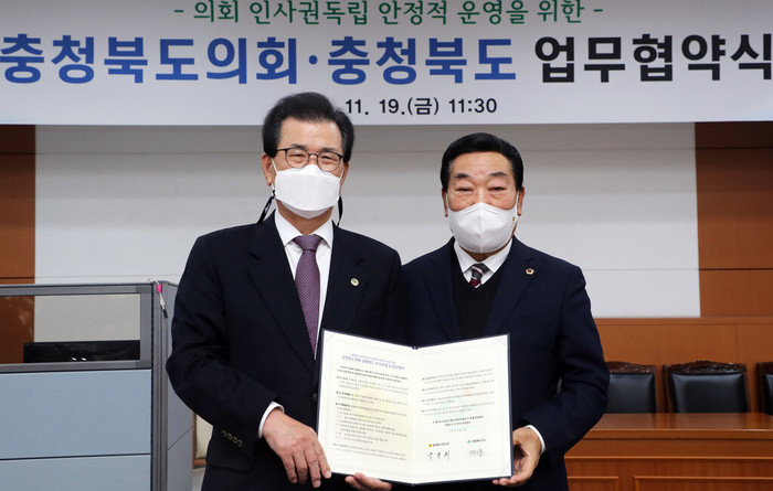 [충북=세계타임즈 이현진 기자] 충청북도의회와 충청북도는 19일 충북도청 소회의실에서 박문희 의장과 이시종 도지사가 참석한 가운데 지방의회 인사권독립 협력체계 구축을 위한 업무협약을 체결했다.