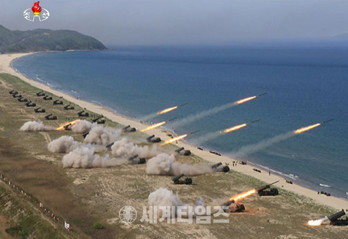 북한 조선중앙TV는 지난 25일 인민군 창건 사상 최대규모의 군종합동타격시위를 진행했다고 26일 보도했다. 이날 훈련에는 김정은 위원장도 참관했다. 사진은 이날 타격시위 모습. 2017.04.26. (사진=조선중앙TV) 뉴시스