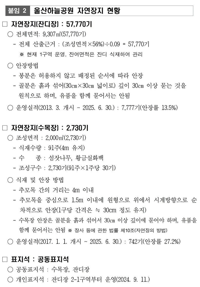 울주군 삼동면에 위치한 울산하늘공원은 울산 유일의 공영장사시설로 지난 2013년 개원 이후 올해 상반기까지 자연장지 이용 건수가 총 8,519건, 유택동산은 5,450건에 달한다.