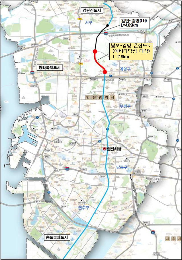 - 총사업비 2,135억 원 투입…35km 남북 간선도로 완성으로 교통난 해소 기대 - [인천 세계타임즈=심하린 기자] 인천광역시(시장 유정복)는 인천 북부의 검단지역과 남부의 송도지역을 연결하는 신규 남북 간선축의 핵심 도로인 ‘봉오–경명 혼잡도로 건설사업’이 제2차 예비타당성조사 대상 사업으로 선정됐다고 20일 밝혔다.