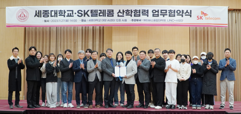 이날 세종대학교 대양AI센터에서 열린 MOU 체결식에는 SKT 김혁 미디어제휴담당과 세종대학교 엄종화 행정부총장, 송형규 메타버스융합대학원 사업단장 등 양측 주요 관계자들이 참여해 글로벌 AI 콘텐츠 인재 육성에 힘을 모을 것을 합의했다.