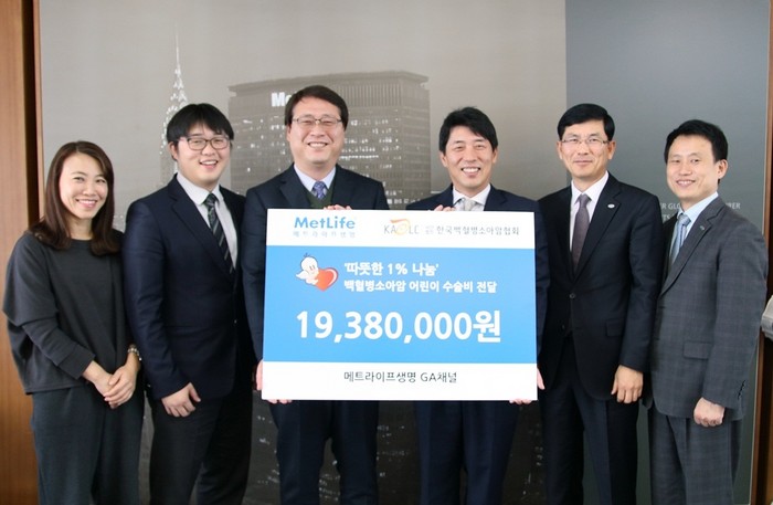 이번에 마련한 기부금은 메트라이프생명이 자사 GA채널이 10월에 모집된 누적 월납보험료의 1%를 기부하기로한 결과다. 이렇게 조성된 총 2천만원의 기부금은 (사)한국백혈병소아암협회를 통해 벽혈병소아암을 앓고 있는 소외계층 아동의 수술비 지원에 전액 사용된다.