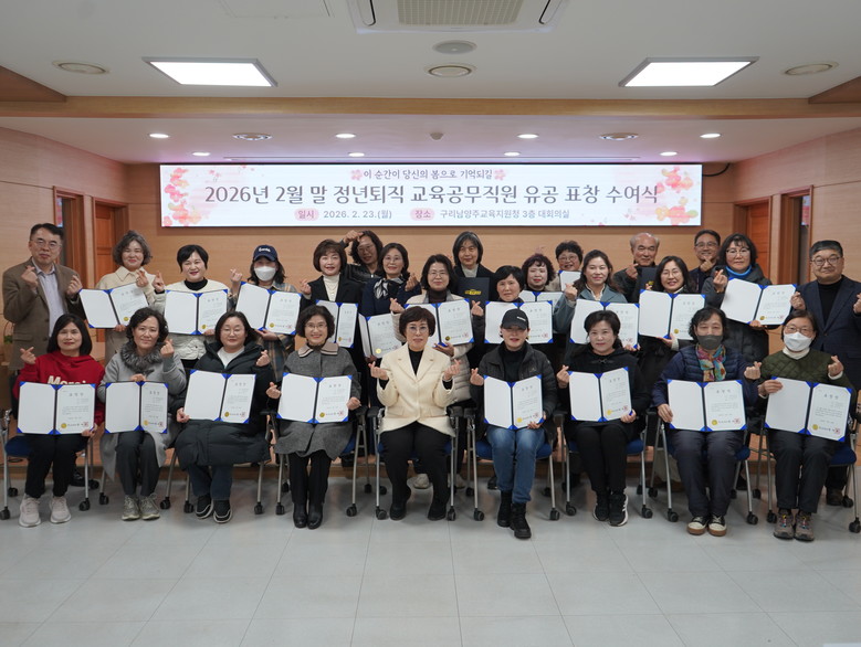 구리남양주교육지원청 서은경 교육장은 “맡은 자리에서 최선을 다해 주신 시간이 있었기에 우리 아이들이 안전하고 행복한 환경 속에서 성장할 수 있었다”며, “새로운 시작 앞에 늘 건강과 행복이 함께하길 바란다.”고 말했다.