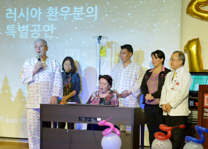 외국인환자로는 최초로 이번 송년행사에 함께한 예브게니(73)씨는 성악가(바리톤) 이며 학교 교장선생님을 역임한 교육자로 H+양지병원에서 전립선암 수술을 받고 경과가 좋아 젊은 시절 피아니스트로 활약한 부인 루드밀라(70세) 여사와 함께 무대에서 멋진 성악을 선보였다.