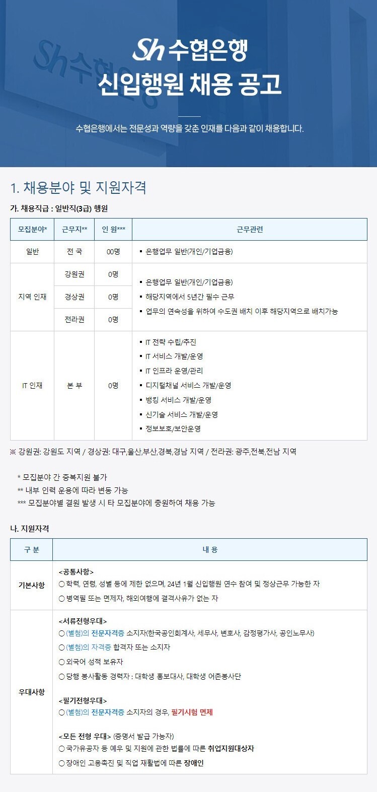 2023년도 하반기 신입행원 공채 지원은 수협은행 채용 전용(인크루트) 홈페이지에서 온라인 접수로만 가능하며, 전형별 일정 등 보다 자세한 사항은 수협은행 홈페이지에서 확인할 수 있다.