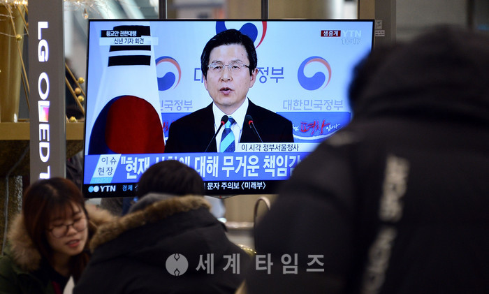 23일 오전 인천공항 도착장에서 여행객들이 황교안 대통령 권한대행 국무총리의 신년 기자회견을 생방송으로 지켜보고 있다. 2017.01.23.