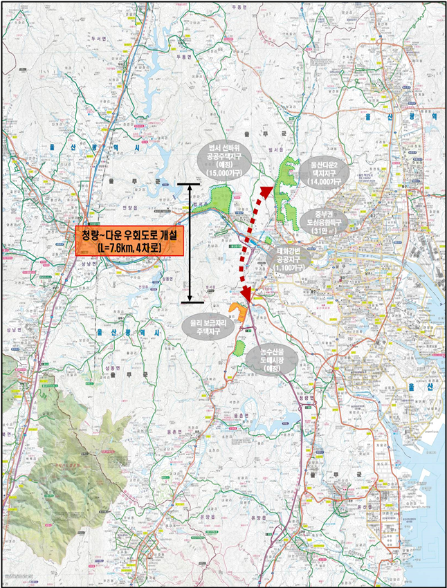 또 ▲청량~다운(국도14호선)은 울주군 청량읍(율리차고지)~다운2지구(국도14호선)를 연결하는 연장 7.6km, 4차로 도로이다.