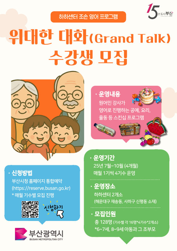 ◈ 수강 신청은 시 통합예약시스템(reserve.busan.go.kr)에서 할 수 있으며, 오는 10월까지 총 4기수로 운영… [부산 세계타임즈=이용우 기자] 부산시(시장 박형준)는 신노년세대 사회참여 공간인 하하센터에서 오늘(17일)부터 6월 30일까지 15분도시 부산의 조손 영어프로그램 '위대한 대화(Grand Talk)' 강좌 1기 수강생을 모집한다고 밝혔다.