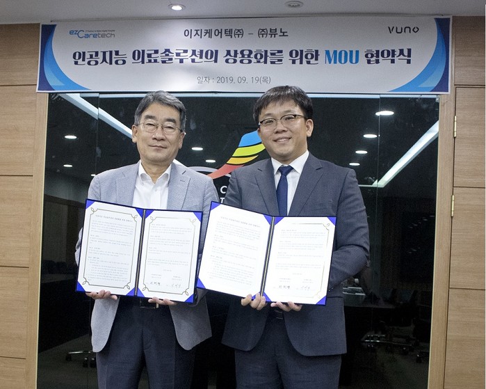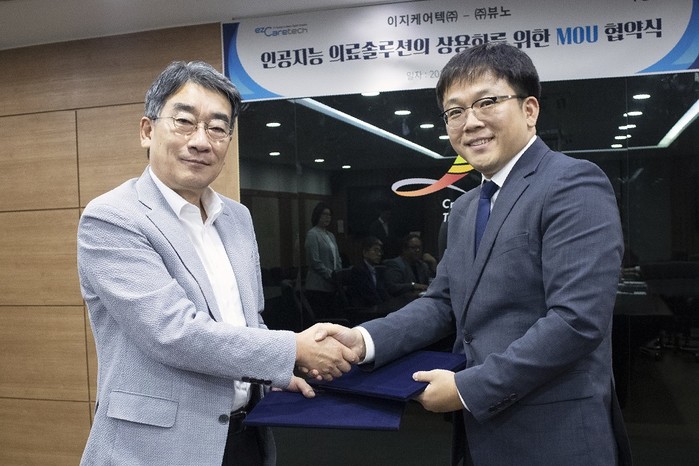 | ▲뷰노-이지케어텍 업무협약 체결식(왼쪽부터 이지케어텍 위원량 대표, 뷰노 이예하 대표)] |