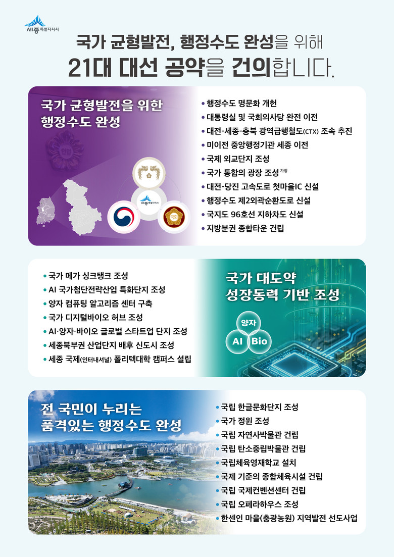 대선 공약 과제는 시가 행정수도로서 지위와 기능을 확고히 하고 국가 차원의 인공지능(AI)·양자·바이오 등 미래전략기술 중심의 성장동력 확보와 행정수도에 걸맞은 문화 기반 조성 등을 중심으로 구성됐다.