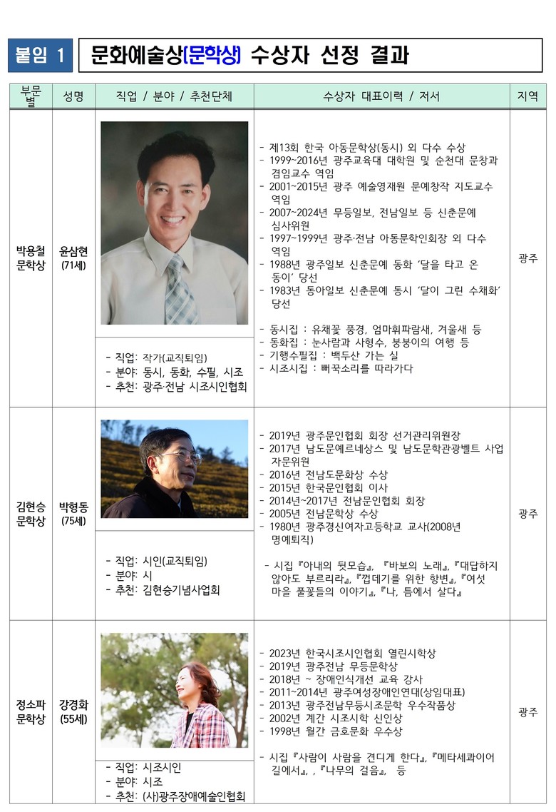 - 박용철·김현승·정소파 시인 문학정신 기리고 문학저변 확대 [광주 세계타임즈=손권일 기자] 광주광역시(시장 강기정)는 2024 광주문화예술상 문학분야 수상자로 윤삼현 작가, 박형동 시인, 강경화 시조시인 등 3명을 선정, 19일 오후 3시 광주문학관에서 시상식을 개최한다.