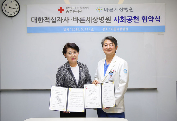 보건복지부 지정 관절전문병원인 바른세상병원(병원장 서동원)은 지난 5월 11일(금), 대한적십자사 경기도지사 중부봉사관(관장 송순화)과 ‘지역사회 건강증진 및 사회공헌활동 확대’를 위한 업무협약을 체결했다고 밝혔다.