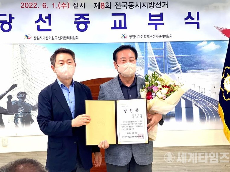 [세계타임즈 = 이진화 기자] 제8회 전국동시지방선거에서 재선된 국민의힘 강용범 창원시 제8선거구 도의원 당선자가 창원시 마산합포구 선거관리위원회로 부터 당선증을 받고 기념촬영을 하고있다[강용범 선거사무소 제공]
