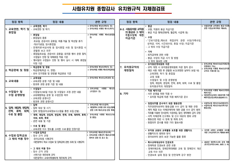 향후 종합감사 이전 단계에서 유치원이 자체적으로 규칙을 점검하고 보완할 수 있도록 ‘사립유치원 유치원규칙 자체점검표’를 배포해, 감사취약분야를 사전에 예방하고 자율적인 개선을 유도할 계획이다.
