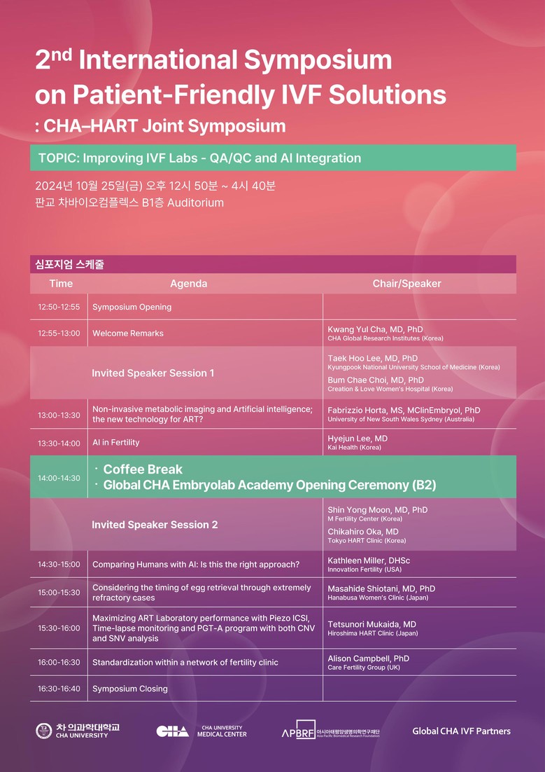 이번 심포지엄은 세계적인 난임·생식의학 의료진과 연구진을 보유한 차 의료원과 차 의과학대학교, 아시아태평양생명의학연구재단이 함께 개최하는 행사로 세계적으로 권위 있는 난임·생식의학 연구자들이 참석한다. 파브리치오 호르타 호주 뉴사우스웨일스대학교 교수와 캐슬린 밀러 미국 Innovation Fertility 최고 과학 책임자, 앨리슨 캠벨 영국 케어 난임그룹 최고 과학 책임자, 시오타니 마사히데 일본 하나부사 여성 클리닉 원장, 무카이다 데쓰노리 일본 히로시마 HART 클리닉 원장 등이 발표에 나서며, 국내·외 200명 이상의 난임 연구자가 모여 인공지능과 접목한 최신 난임 치료 기술을 공유하고 새 치료법 등을 논의한다.