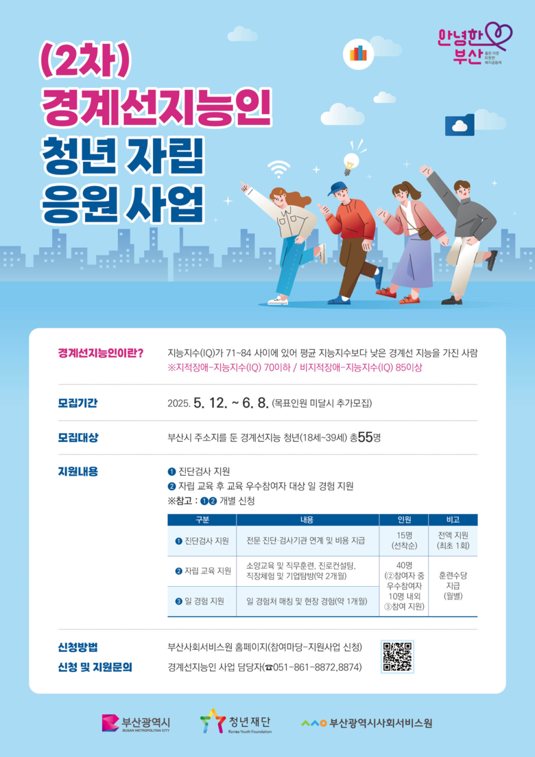 ◈ 경계선지능 청년의 직장생활 적응력 향상과 현장 경험을 바탕으로 산업 전반 다양한 분야로의 취업과 진출 지원 [부산 세계타임즈=이용우 기자] 부산사회서비스원(원장 유규원)은 장애에 해당하진 않지만 지능지수가 71~84 사이의 제도적 사각지대에 놓인 ‘경계선지능인’의 사회적 지원을 위한 청년 자립 응원 사업 2차 대상자를 다음 달 8일까지 모집한다.