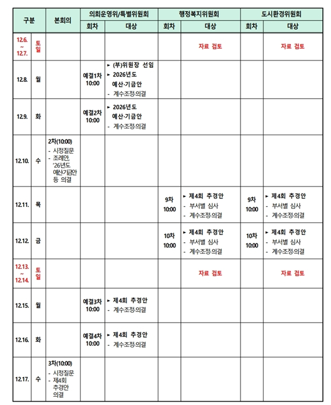 이후 12월 11일부터는 2025년도 제4회 추가경정예산안 심사가 본격 진행돼 연말 재정 운용 상황을 점검하게 된다. 회기 마지막 날인 12월 17일에는 제3차 본회의가 열려 시정질문과 함께 제4회 추가경정예산안이 최종 의결되면서 이번 정례회 일정이 마무리될 예정이다.