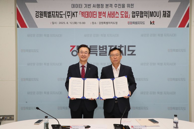 [강원도 세계타임즈=김민석 기자] 강원특별자치도(도지사 김진태)는 ㈜케이티(KT)와 8월 12일(화), 도 영상회의실에서 데이터 기반 에이아이(AI)행정 본격 시행을 위한 「민간데이터 공동활용 추진 업무협약(MOU)」을 체결하였다.