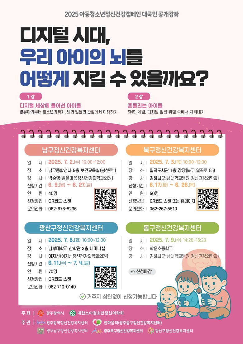 배강숙 건강위생과장은 “디지털 환경이 아이들의 일상 깊숙이 자리 잡은 만큼 올바로 이해하고 대응하는 것이 중요하다”며 “이번 공개강좌가 아이들의 정신건강을 지키는 실질적인 계기가 되길 바란다”고 말했다.