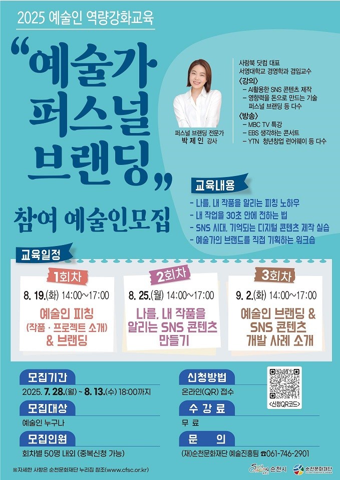- 예술인 피칭, SNS 콘텐츠, 예술인 브랜딩 각 분야 전문가와 함께하는 교육 - [순천시 세계타임즈=우덕현 기자] 순천문화재단(이사장 노관규)은 지역 예술인 역량강화교육의 일환으로 진행되는 ‘예술가 퍼스널 브랜딩’ 교육 참여예술인을 오는 13일까지 모집한다고 밝혔다.