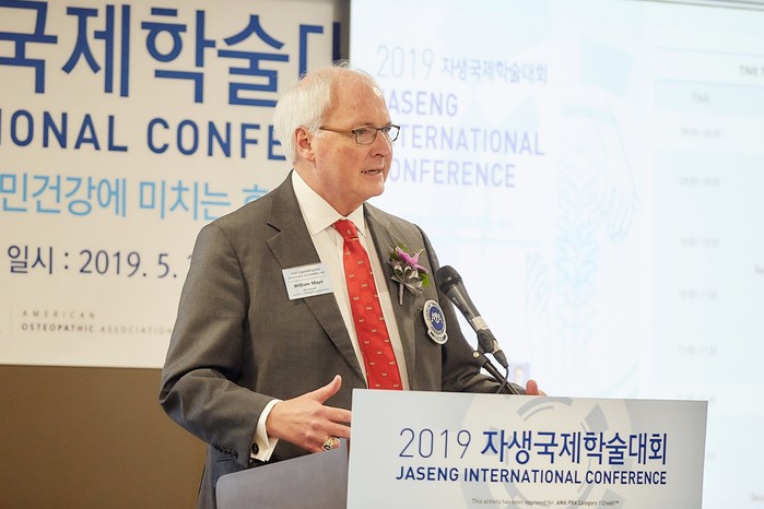 | ▲‘2019 자생국제학술대회’에서 미국 오스테오페틱의학협회(AOA) 윌리엄 메이요 회장이 연설하고 있다. |