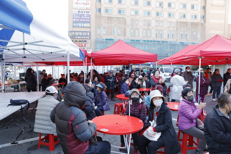 특히 이날은 무료 급식도 함께 있어 김장하기가 끝나자 바로 따끈한 돼지 수육과 시래깃국, 삼색나물, 생미역 등으로 맛있는 식사를 어르신 250분께 대접을 하고 돌아가시는 어르신들에게 김장 김치 한 쪽씩을 나눠드렸다.