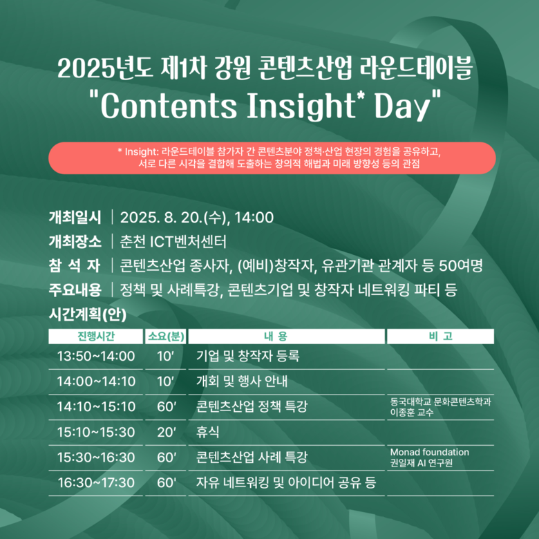 ・새 정부의 콘텐츠산업 정책, AI 실제 적용 사례를 통한 AI 도입 방법과 전략 강의 진행 [강원도 세계타임즈=김민석 기자] 강원문화재단(대표이사 신현상)은 20일(수) 춘천 ICT 벤처센터에서 2025년도 제1차 강원 콘텐츠산업 라운드테이블 ‘Contents Insight Day’를 개최한다.